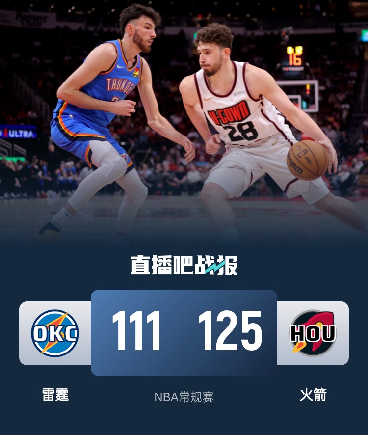 比赛开始,双方开场势均力敌,比分始终紧咬,杰伦-格林连投带罚带队取得两位数优势,次节双方继续缠斗,火箭突然发力轰出14-0的进攻高潮将分差拉开到20分,雷霆连中4记三分止住颓势,半场战罢火箭69-53领先雷霆。易边再战,火箭重获20分领先,但雷霆内外开花完成10-2的攻击波迅速迫近比分,泰特成为奇兵连中三分稳住局势,亚历山大挺身而出内外开花连续拿分缩小分差,末节双方围绕10分分差展开激烈争夺,杰伦-格林连续拿分保持优势,申京劈扣一锤定音。最终,火箭125-111力克雷霆,终结了对手的11连胜。