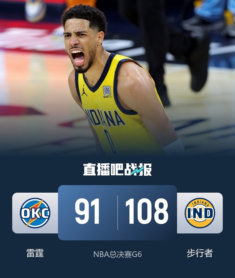 6月20日讯 NBA总决赛G6,步行者回到主场迎战雷霆。目前大比分雷霆3-2领先。