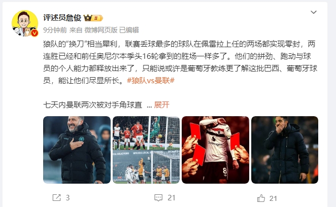 12月27日讯 本轮英超,曼联0-2不敌狼队,赛后评述员詹俊发文。