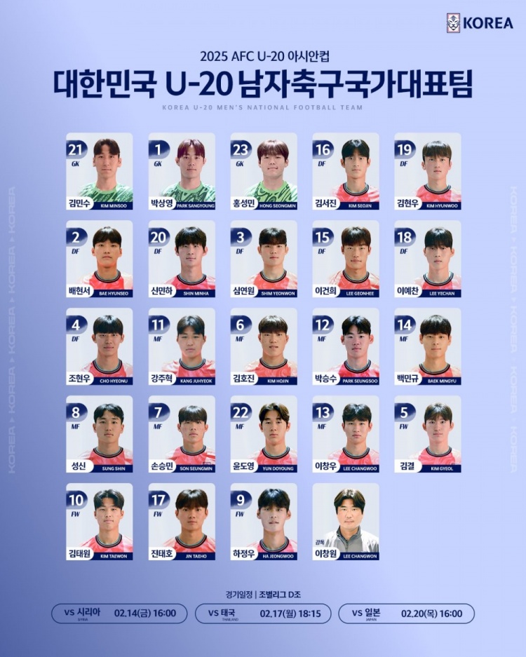 2月14日讯 韩国U20队今天下午将迎来与叙利亚U20队的亚青赛首战,韩国足协官方公布球员号码,传闻即将转会布莱顿的尹棹泳身穿22号球衣。