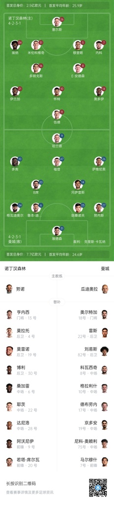 诺丁汉森林首发:26-塞尔斯、5-穆里略、7-内科-威廉姆斯、16-尼古拉斯-多明戈斯、31-米伦科维奇、34-埃纳、8-埃利奥特-安德森、10-吉布斯-怀特、11-克里斯-伍德、14-奥多伊、21-伊兰加