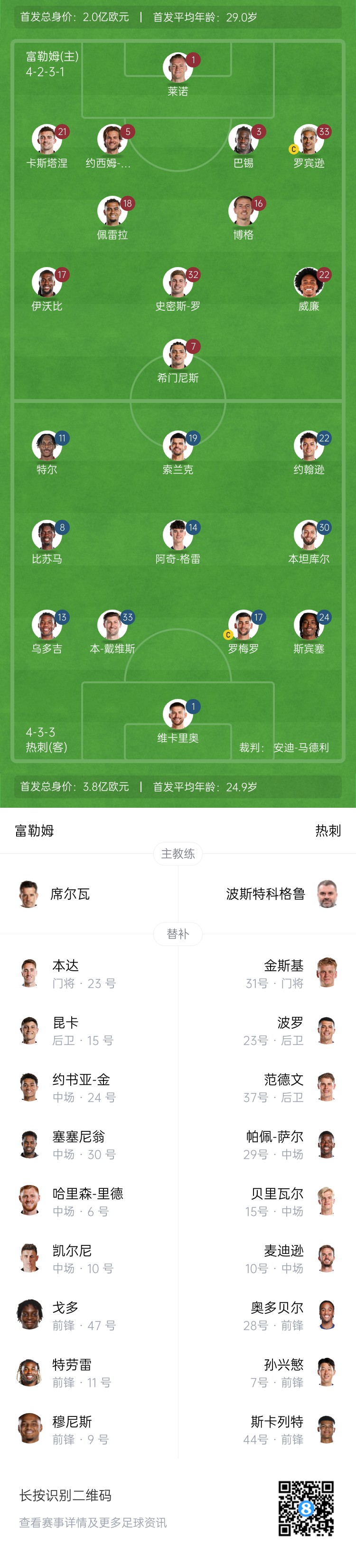 富勒姆首发:1-莱诺、3-巴锡、5-安德森、21-卡斯塔涅、33-安东尼-罗宾逊、16-桑德-博格、18-佩雷拉、32-史密斯-罗、17-伊沃比、22-威廉、7-劳尔-希门尼斯