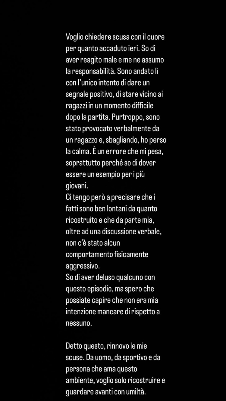 扎尼奥洛写道:“我想真诚地为昨天发生的事情道歉,我知道自己的反应很糟糕,我对此负责。我去那里的唯一目的是传递一个积极的信号,在比赛后的艰难时刻陪伴年轻球员们。遗憾的是,我被一个孩子的言语挑衅,错误地失去了冷静。这个错误让我感到很沉重,尤其是因为我知道自己应该为年轻人树立榜样。