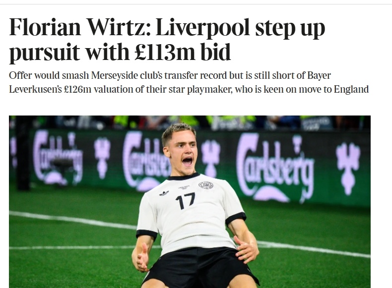 DO的报道与泰晤士报的数字一致,都是1.13亿镑(1.34亿欧)的报价,包括1亿镑(1.187亿欧)的基础付款,以及1300万镑(1540万欧)的附加金额,可以预见绝大多数资金都是有保障的;利物浦无意为维尔茨出价1.264亿镑(1.5亿欧)。