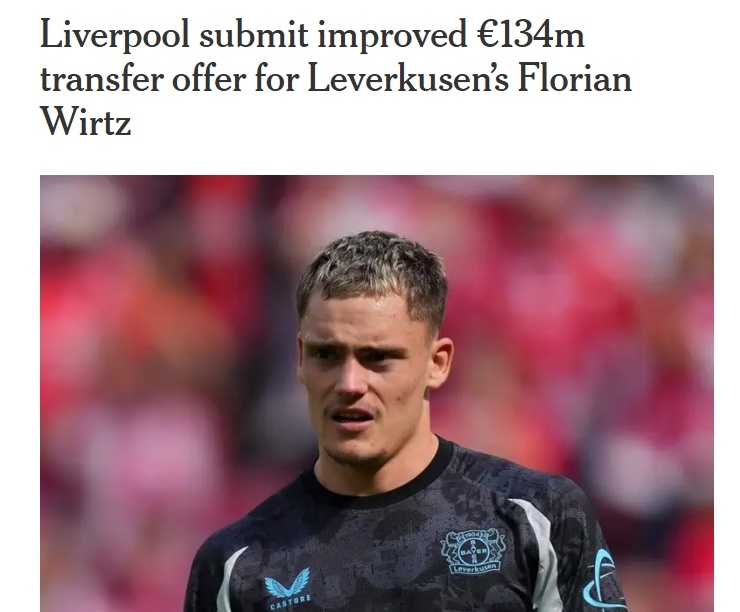 利物浦向勒沃库森提交了修改后的1.13亿镑报价,基础转会费1亿镑,浮动1300万镑,低于勒沃库森索要的1.26亿镑(1.5亿欧)要求。