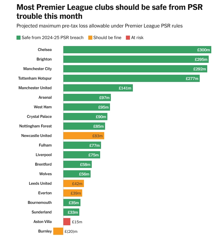 TA估算英超20队PSR安全值:切尔西本赛季3亿镑上限,维拉有风险