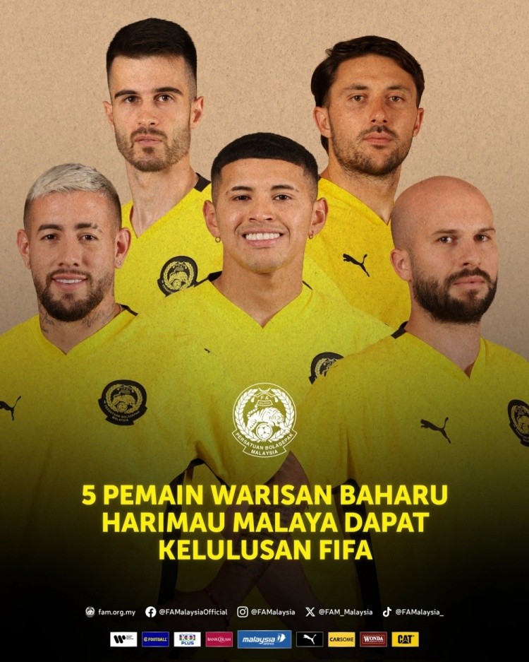 6月10日讯 马来西亚足协今日官方宣布,国际足联已经同意了5名入籍球员的参赛资格,他们将可以代表马来西亚国家队出战与越南队的亚洲杯预选赛第三阶段比赛。