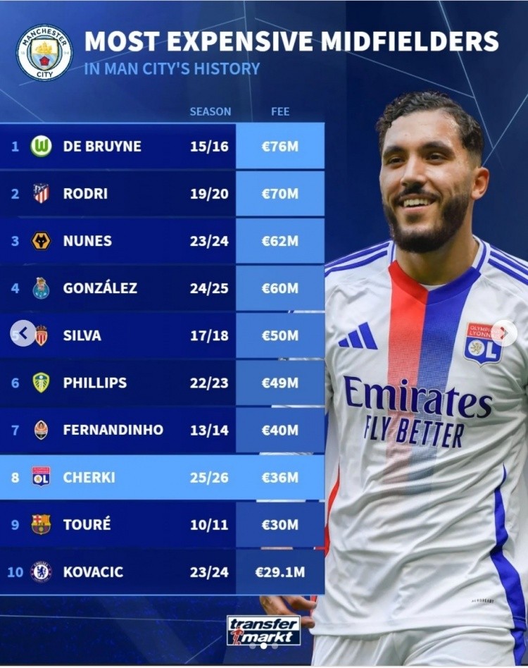 6月11日讯 曼城签下里昂攻击手谢尔基,德国转会市场统计了曼城引进中场球员的转会费,并列出榜单,谢尔基3600万欧排名第8位。