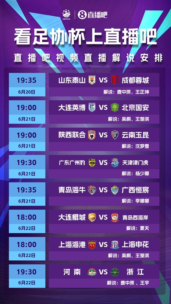 今天18:00,足协杯1/8决赛的上海德比便将开战,吴桐和王楚淇将会解说这场“上上策”。同时进行的比赛还有夏天解说的大连鲲城vs青岛西海岸。晚上19:30,河南与浙江展开对话,鹿中原将与王宇一起,和吧友们“逐鹿中原”。