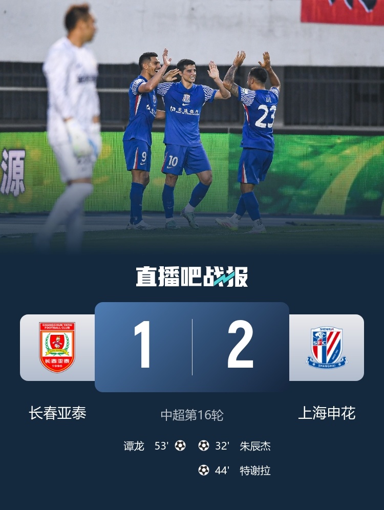 全场比赛结束,上海申花客场2-1战胜长春亚泰。