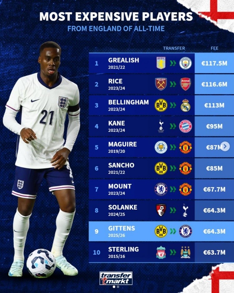 英格兰球员转会费榜:格拉利什、赖斯、贝林均过亿,吉滕斯第9