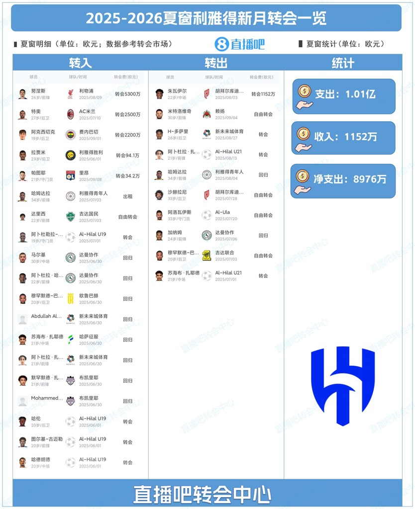 为吧友们总结了利雅得新月今夏的转会操作,吧友们能打几分?