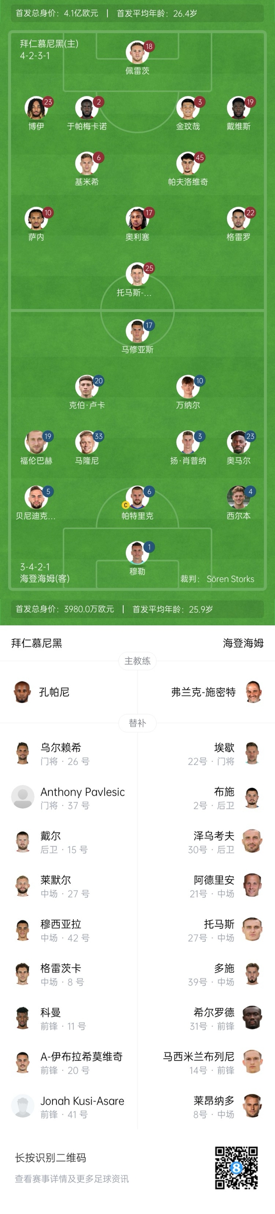 拜仁替补:26-乌尔赖希、37-帕夫莱西奇、15-戴尔、8-格雷茨卡、27-莱默尔、11-科曼、20-阿尔杨-伊布拉希莫维奇、42-穆西亚拉、41-阿萨雷