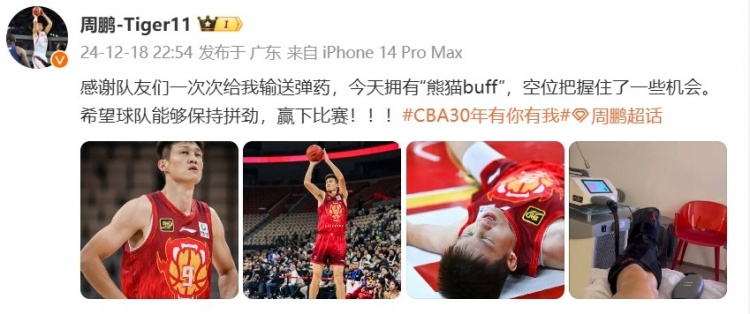 赛后,周鹏发博写道:“感谢队友们一次次给我输送弹药,今天拥有‘熊猫buff’,空位把握住了一些机会。希望球队能够保持拼劲,赢下比赛!”