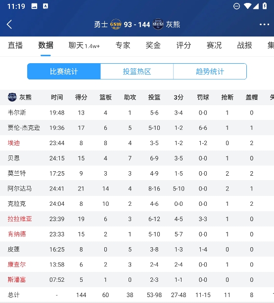 12月20日讯 勇士今日客战93-144被灰熊51分血洗。