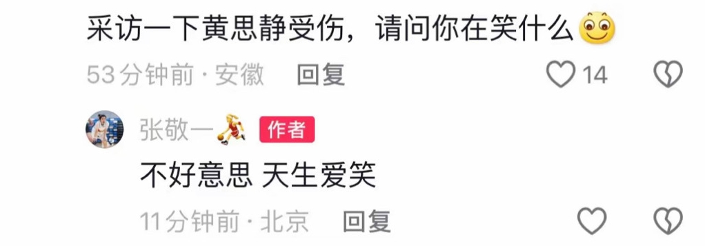 有网友在社媒“声讨”北京女篮队员张敬一:“采访一下黄思静受伤,请问你在笑什么。”。张敬一则回应:“不好意思,天生爱笑。”