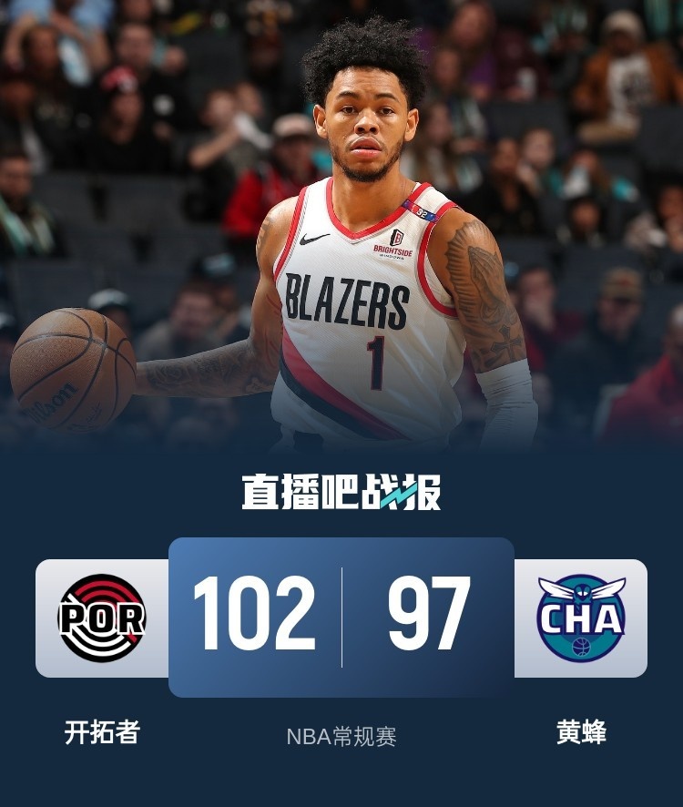 比赛开始,克林根内线连续送出盖帽,但黄蜂外线突然开火连中4记三分,轰出16-0直接建立双位数领先,西蒙斯接连三分追到差8分,次节黄蜂7-2再次领先到双位数,但格兰特接连三分单节轰下13分一度带队追平比分,半场黄蜂还领先4分。下半场,开拓者上来11-0一度反超比分,随后双方都犯满后频繁走上罚球线,三节黄蜂只领先2分,末节双方继续胶着,西蒙斯接连中远投带队7-0建立领先,随后开拓者保持住两球以上领先,格兰特中投杀死比赛,最终开拓者102-97力克黄蜂,拿到4连胜。