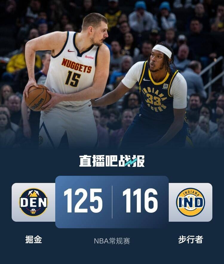 开场后约基奇不断为队友送出助攻,戈登状态火热抓住机会内外开花,掘金半节时间建立起11分优势。步行者利用轮换阵容追分,穆雷两记三分强势回应。第二节上来穆雷延续手感又是两记三分命中,随后步行者接连回敬三分,并且通过反击一路追到只差1分,约基奇帮助掘金再度稳住阵脚。易边再战,掘金在约基奇的带领下依旧是打得十分顺畅,逐渐将分差拉大到两位数,最后一节虽然步行者努力追分,但掘金始终掌控局面没让分差被缩小,最终掘金125-116终结步行者3连胜。