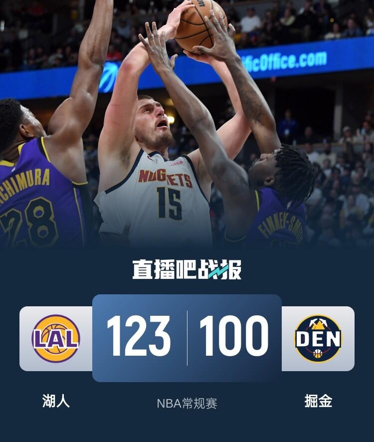 比赛开始,湖人开场不断冲击内线连投带罚拿分,掘金内外开花迅速回应,东契奇攻防两端建功带队取得两位数领先,但下场后掘金完成10-3缩小分差,次节双方围绕10分展开拉锯战,掘金强攻内线连投带罚拿分,詹姆斯得分助攻一肩挑还以颜色,半场战罢湖人63-54领先掘金。易边再战,掘金1分钟打出8-0追到只差1分,湖人回敬10-0重获两位数优势,此后双方继续围绕两位数的分差展开激烈争夺,威少和穆雷连中三分,里夫斯和八村塁外线开火强势回应,末节湖人占得先机打出14-4的攻击波,东契奇连续拿分将优势扩大到20分,掘金大势已去无力回天。最终,湖人123-100客场击败掘金,终结了对手的9连胜。