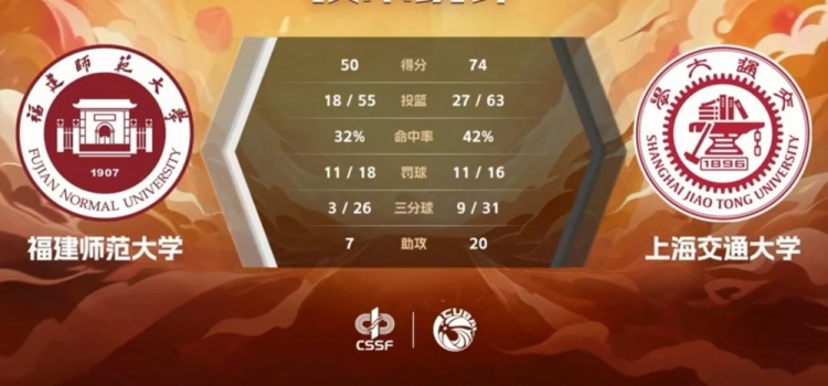 末节比赛,双方围绕20分的分差展开拉锯战,吴泽昊再中三分,上海交大稳扎稳打继续扩大优势,分差一度来到30分,张旭中投还有,福建师大连投带罚稍稍缩小分差,双方耗完剩余时间。最终,上海交大74-50轻取福建师大。