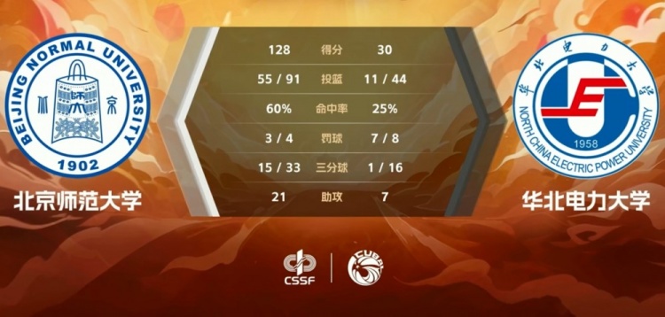 次节回来,华北电力的情况依旧没有好转,两分多钟的时间里又被北京师大打出10-0的小高潮,整个这一节华北电力被限制到只拿2分,而北京师大则是狂轰37分,半场战罢,北京师大65-13领先华北电力。
