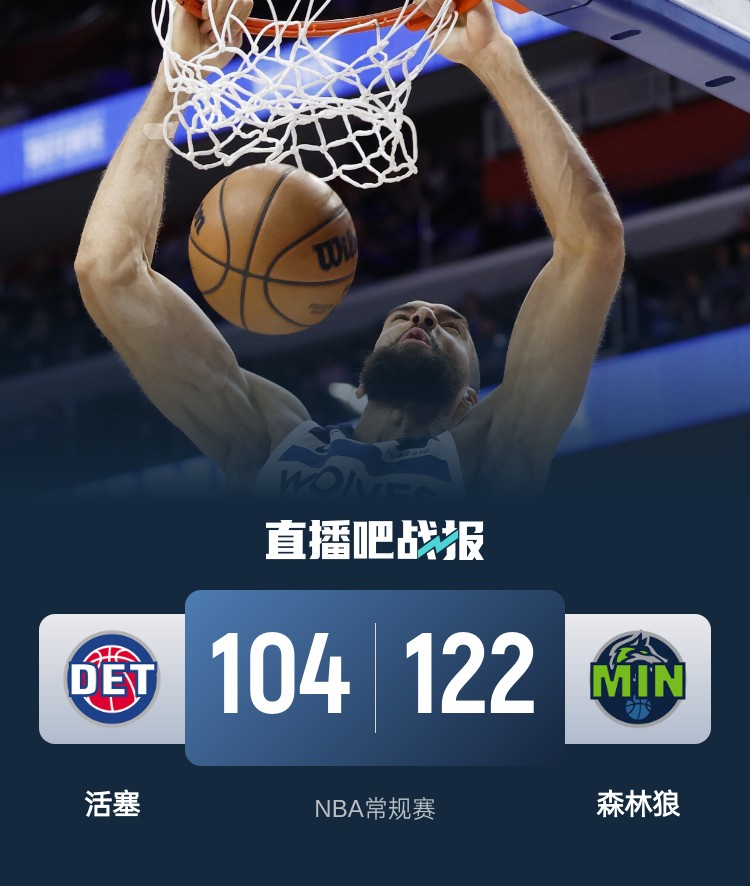森林狼(43-32):兰德尔26分8板5助、爱德华兹25分6板4助2帽、戈贝尔19分25板、康利17分2板2助、沃克11分2板4助、迪文岑佐6分3板3助2帽、克拉克6分2板、米诺特5分、加尔扎4分1助、麦克丹尼尔斯2分9板3助2帽、里德2分2板1助、迪林厄姆1助