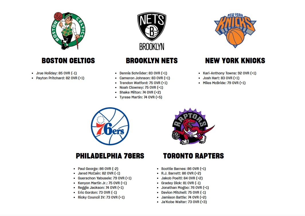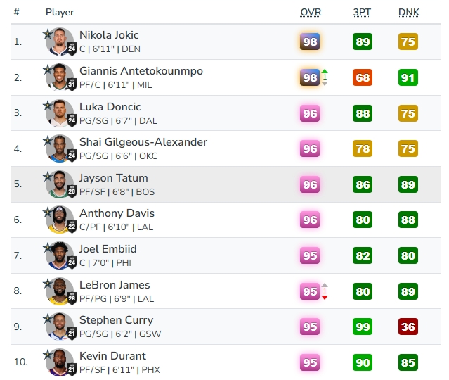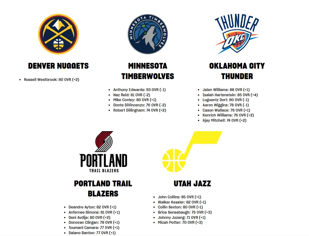 其他重要变动:詹姆斯-1——95,文班亚马+1——92,利拉德+2——91,特雷-杨+1——89,哈尔滕施泰因+4——85,哈登+2——86,威少+2——80。
