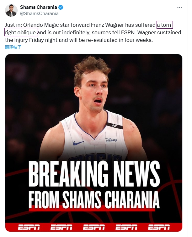 12月08日讯 据ESPN名记Shams报道,数位消息人士透露,魔术球星弗朗茨-瓦格纳遭遇右侧腹斜肌撕裂归期未定,他将在四周后接受伤情的重新评估。