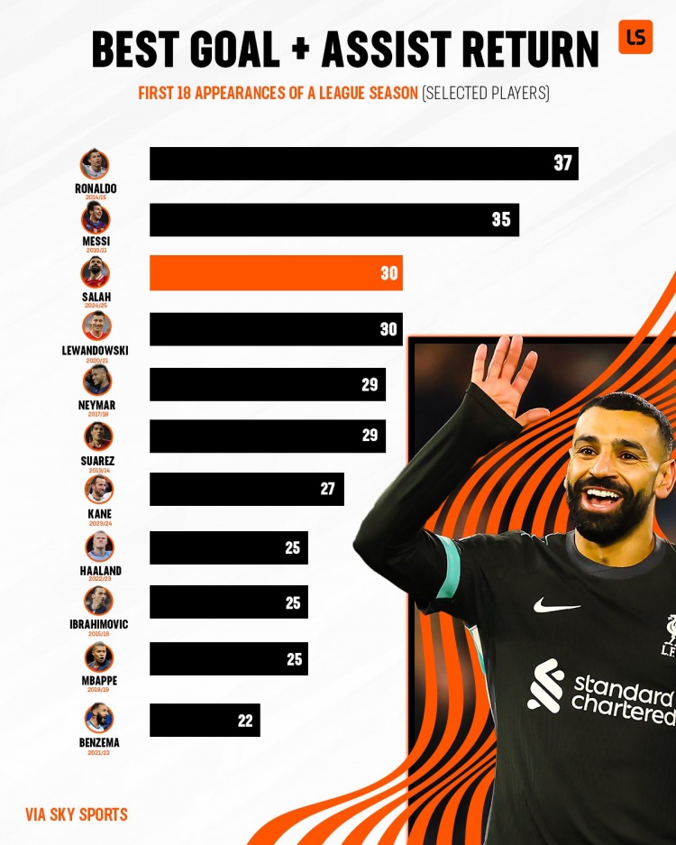 五大联赛前18场参与进球榜:C罗梅西前二,本赛季萨拉赫30球第三