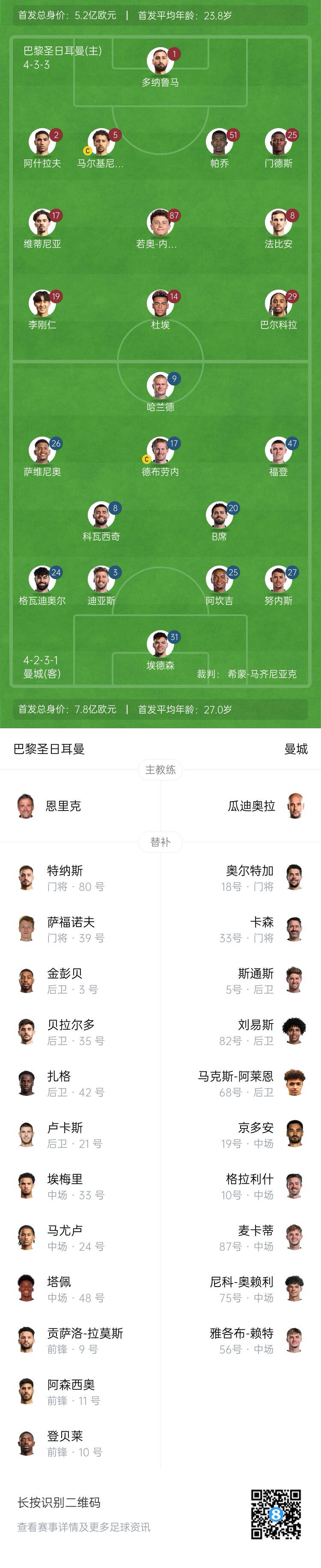 巴黎vs曼城首发:哈兰德、德布劳内、福登先发,登贝莱替补