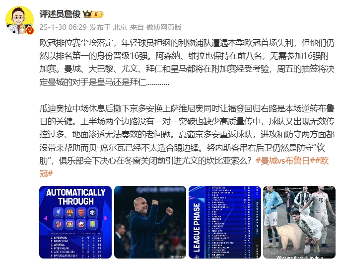 01月30日讯 欧冠联赛阶段8轮全部战罢,詹俊发文谈到了各支球队。