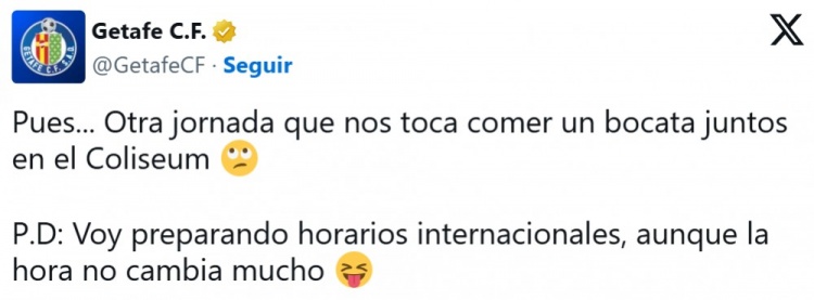 赫塔菲将于本周日下午14:00对阵马竞,而他们下个主场对阵莱加内斯的比赛也是在下午14:00进行。与此同时,西甲联赛宣布了第29轮的赛程,赫塔菲再次在下午14:00主场迎战比利亚雷亚尔,俱乐部在社交网络上调侃这一赛程。