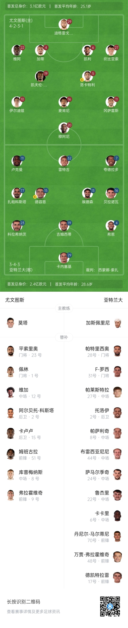 尤文vs亚特兰大首发:穆阿尼、伊尔迪兹、冈萨雷斯出战